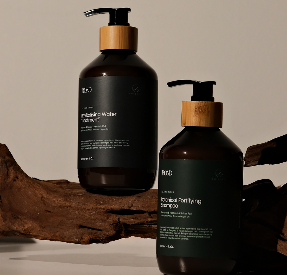 BOND is a botanical hair revival system, featuring: Shampoo (400ml) and Revitalising Water Treatment (400ml), scientifically designed to reduce hair fall by strengthening the scalp and roots, while remaining free from harsh chemicals.