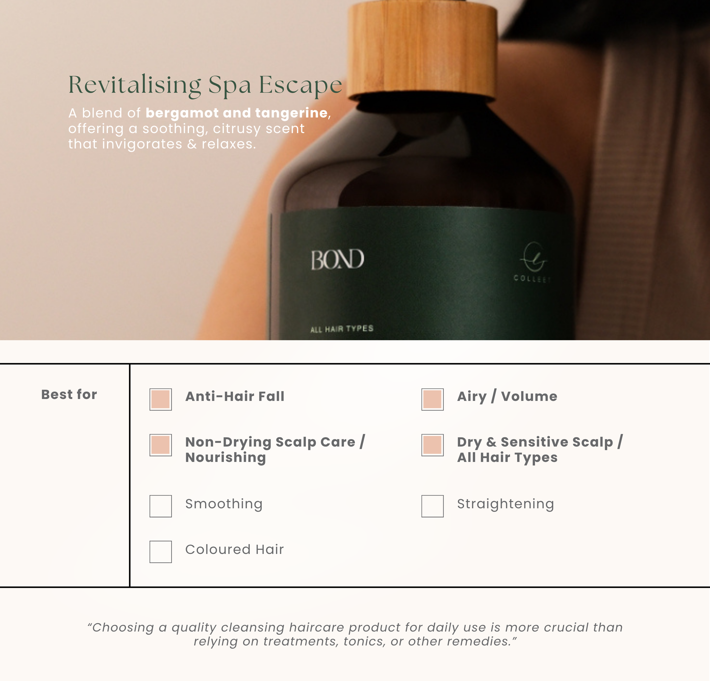 Unlike most sulphate-free shampoos, BOND foams betterโoffering a refreshing, satisfying cleanse that leaves your hair clean, soft, and balanced without stripping away natural moisture.