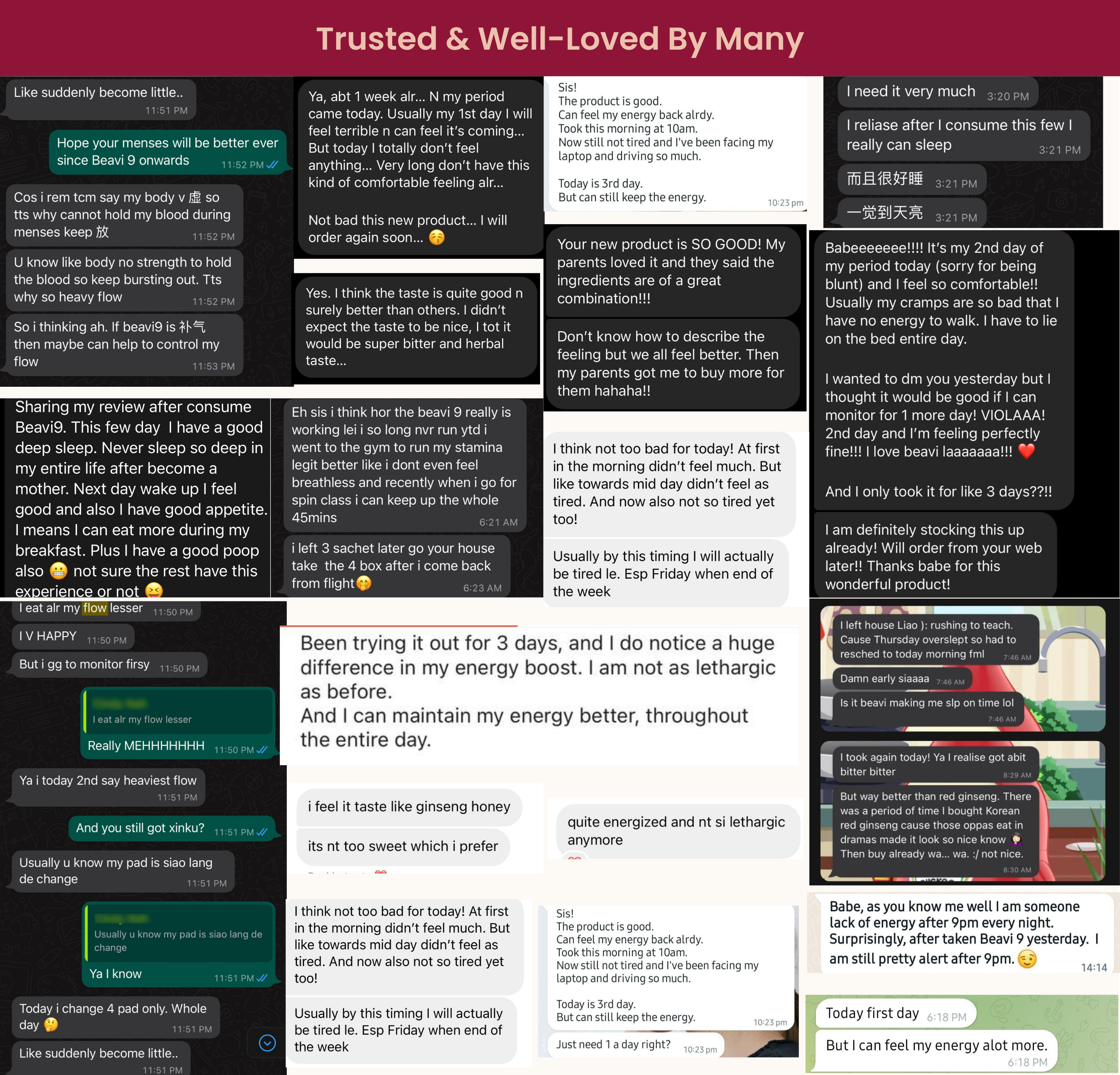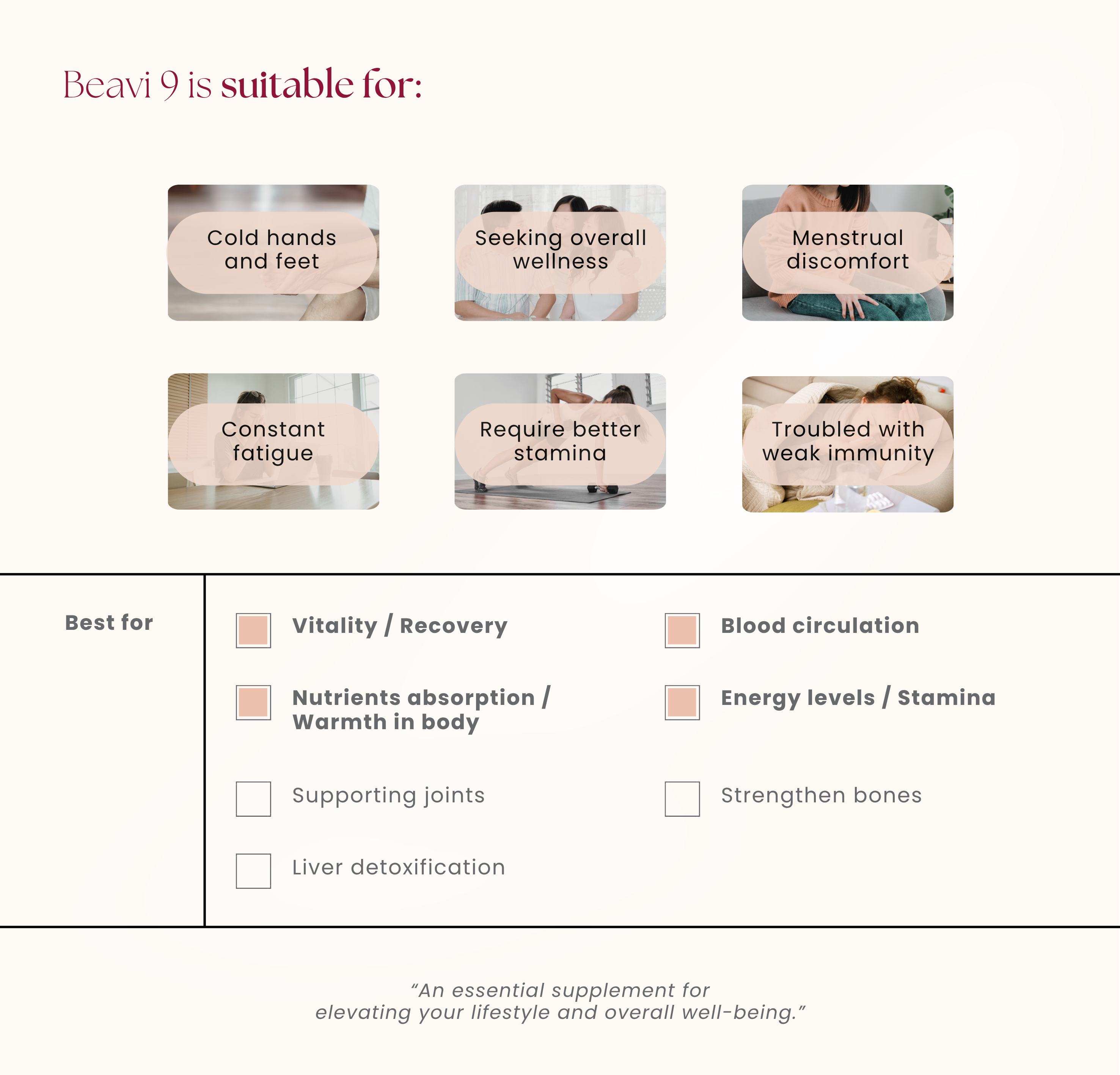 Please avoid mixing Beavi 9 with similar health tonics with ingredients such as Eight Treasure 八珍 and Angelica Sinensis 當歸 to prevent consumption beyond the recommended dosage which may lead to overstimulation in your body.
