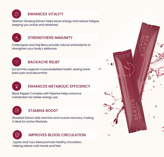 Beavi 9 is a premium herbal health supplement made with 9 powerful botanicals from Asia & Japan, carefully blended to restore energy, boost immunity, and improve circulation.