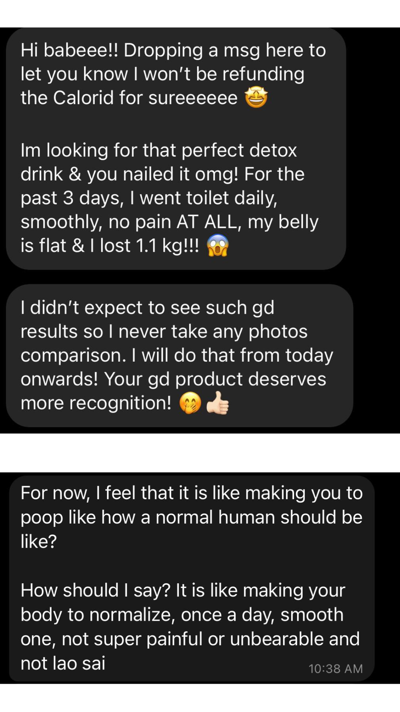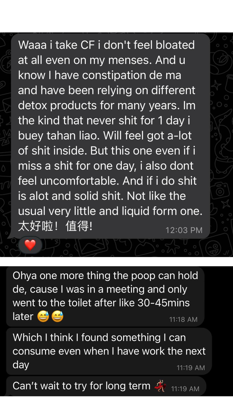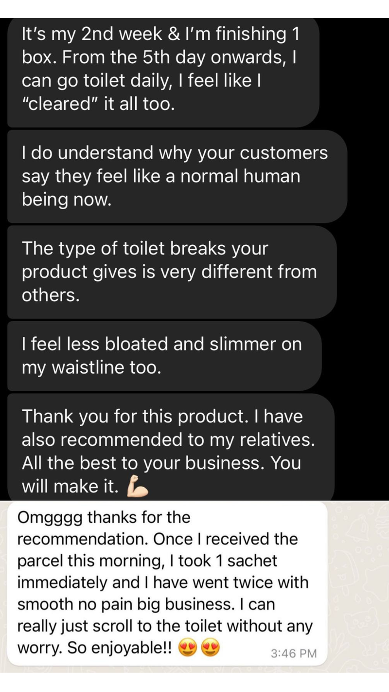 “For the past 3 days, I went toilet smoothly, no pain at all. My belly is flat & I lost 1.1kg."