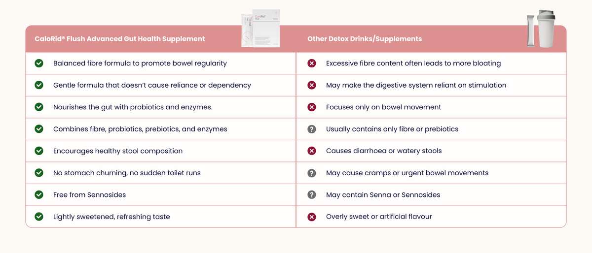 CaloRid® Flush is a carefully crafted gut-health formula designed to reset your system naturally, without the stomach churning or toilet drama of harsh laxatives.