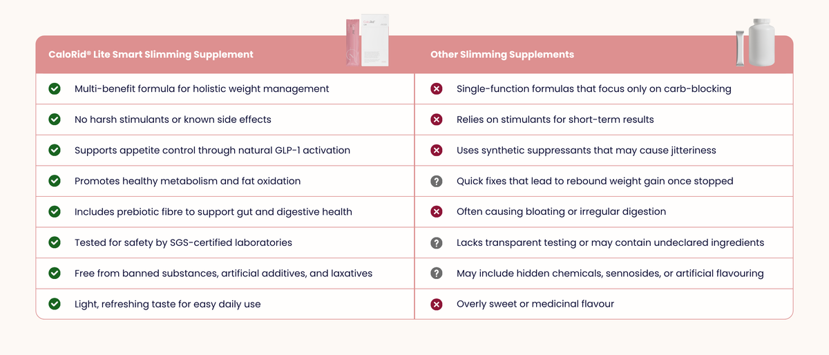 CaloRid® Lite is designed to provide multiple benefits, including carbohydrate blocking, fat metabolism support, appetite regulation, and blood sugar balance.